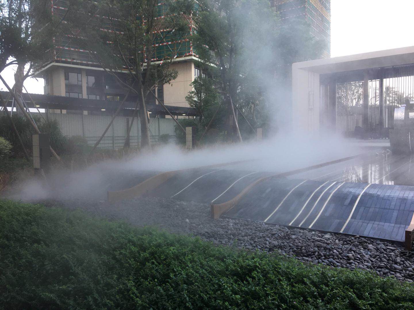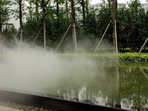 细雾:微雾喷雾咀的高压每秒可产生50亿个液滴,液滴的直径仅为3-10um,就像山上的云一样,它在空气中很快挥发形成水蒸气,具增湿和降温的功用。